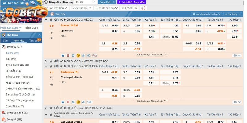 - Đa dạng các loại cược: Gobet không những cung cấp cá độ cho trận đấu nổi bật, mà còn đem tới nhiều loại cược khác nhau, từ truyền thống đến tỷ số chính xác, cược Tài/Xỉu, cược chấp và cược hiệp 1. Chính đa dạng này giúp anh em có thể chọn lựa kiểu cược phù hợp chiến thuật của mình.